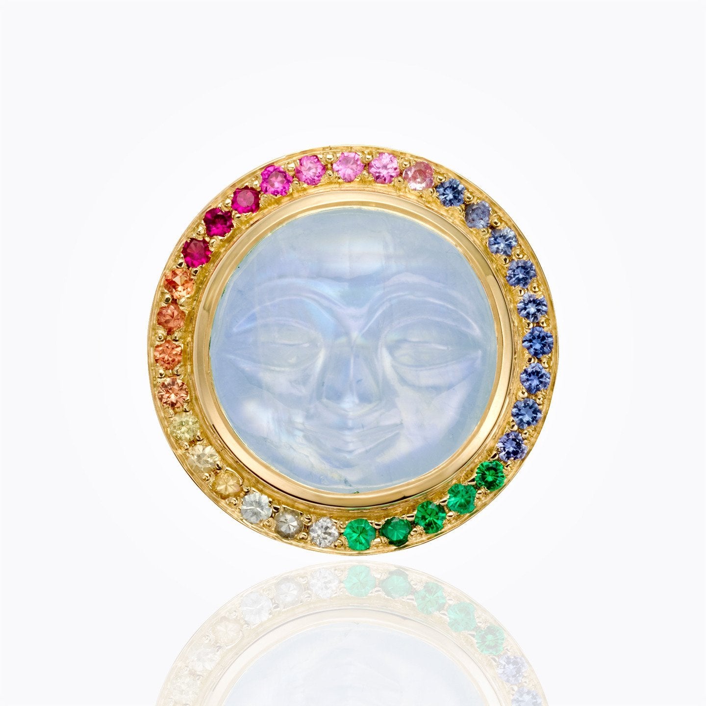 Dimensions: W: 20mm/0.78' Stone Details: Blue Moonstone:9.50cts; Blue Sapphire:0.20cts; Pink Sapphire:0.10cts; Tsavorite:0.10cts; Light Green Sapphire:0.08cts; Light Orange Sapphire:0.06cts; Medium Orange Sapphire:0.08cts; Ruby:0.06cts; diamonds:0.075cts;