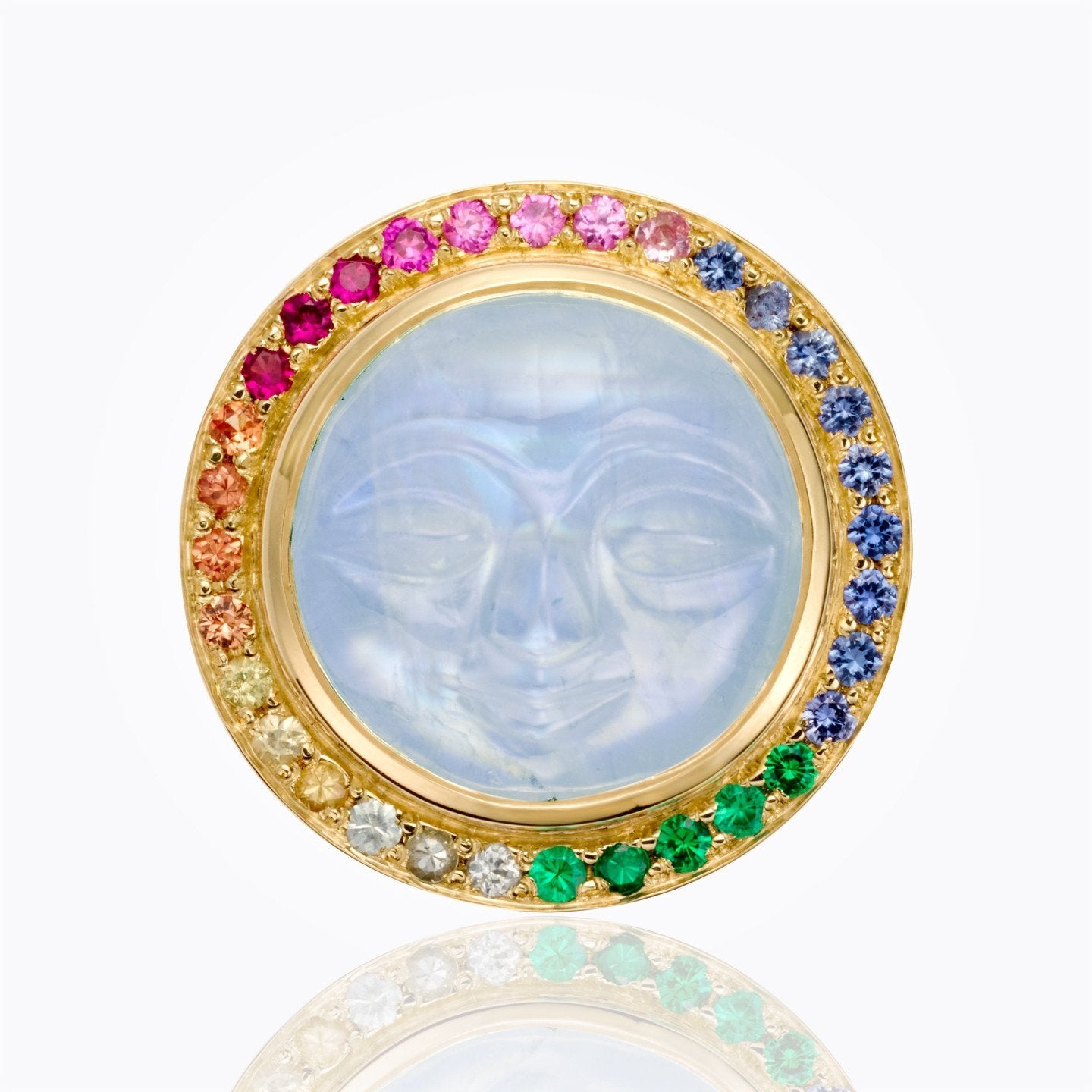 Dimensions: W: 20mm/0.78' Stone Details: Blue Moonstone:9.23cts; Blue Sapphire:0.18cts; Pink Sapphire:0.10cts; Tsavorite:0.10cts; Light Green Sapphire:0.06cts; Light Orange Sapphire:0.06cts; Medium Orange Sapphire:0.08cts; Ruby:0.06cts; diamonds:0.075cts;