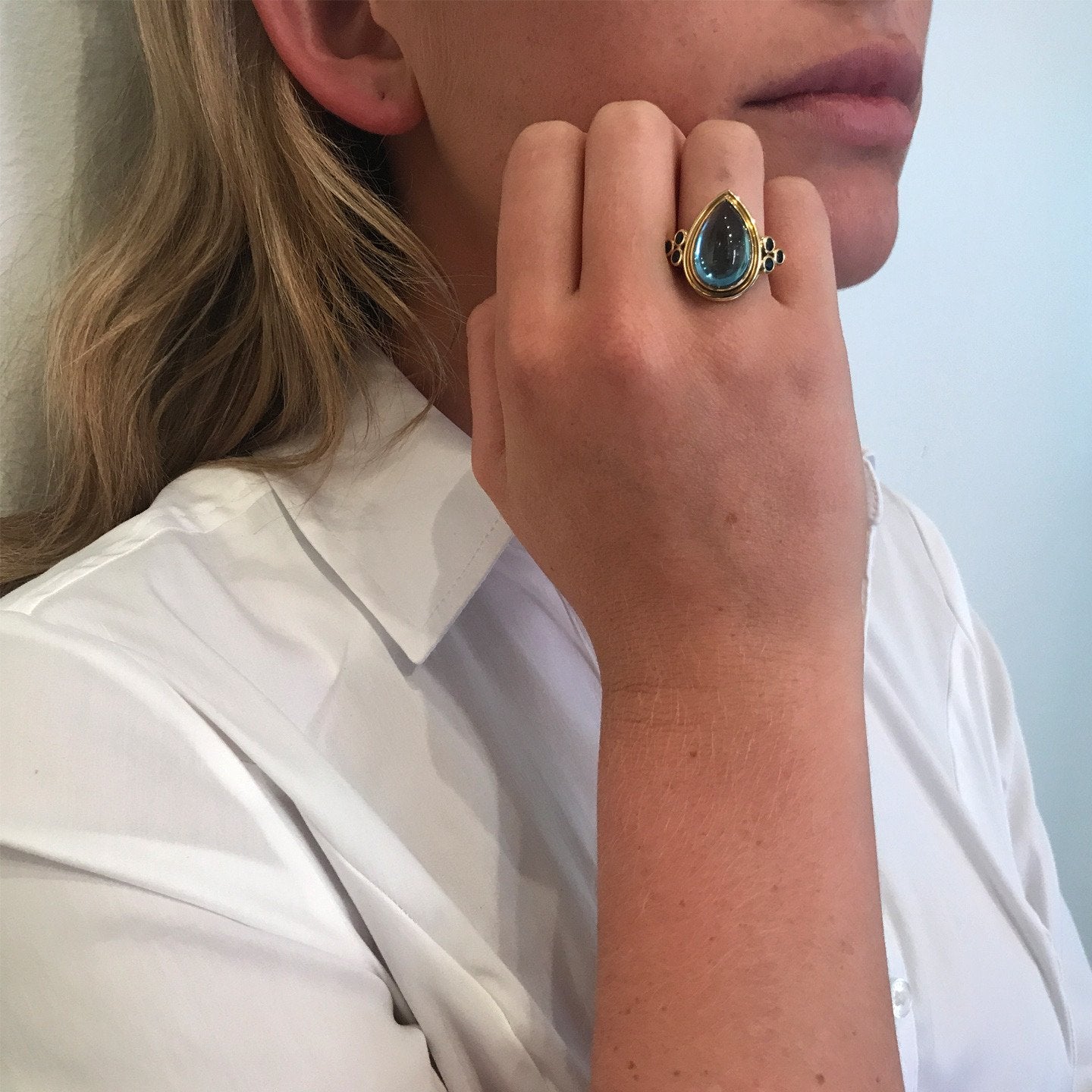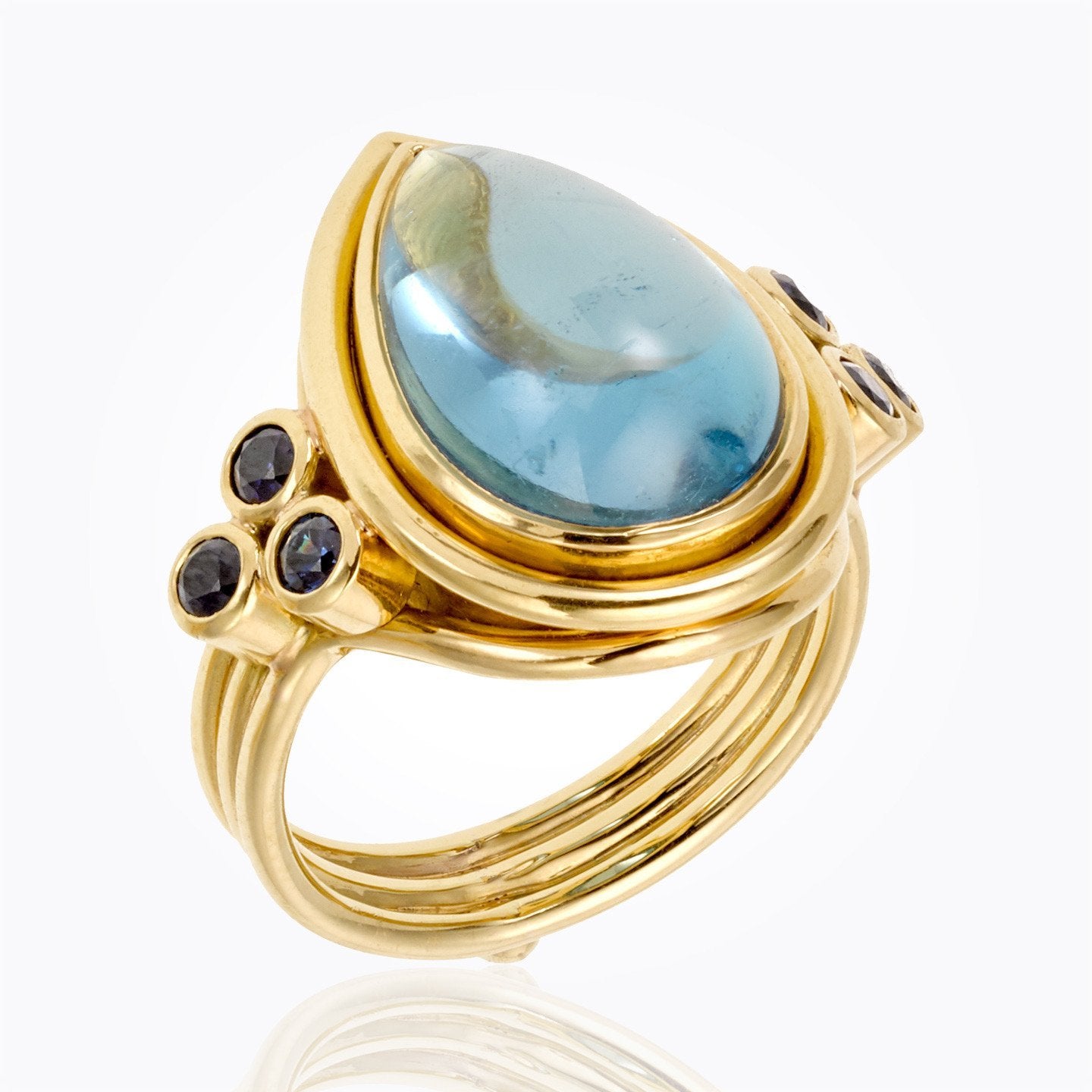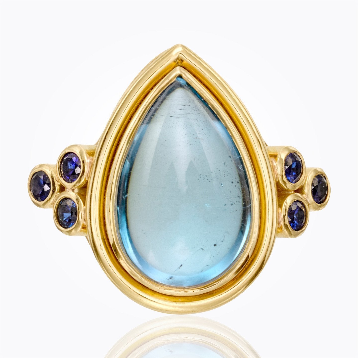 18K Classic Cushion Ring with aquamarine and blue sapphire
