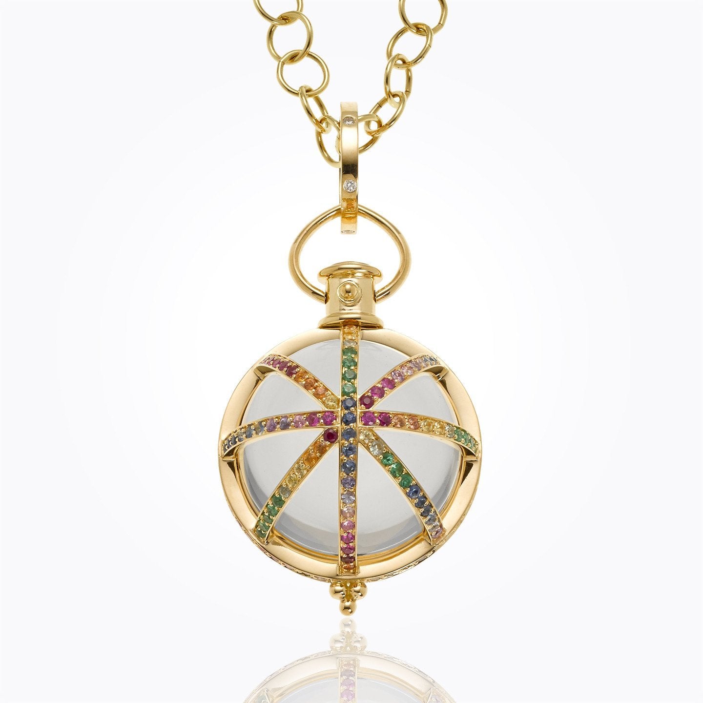 Stone Details: Blue Sapphire:0.84cts; Lavender Sapphire:0.34cts; Pink Sapphire:0.56cts; Ruby:0.28cts; Light Orange Sapphire:0.36cts; Medium Orange Sapphire:0.36cts; Light Green Sapphire:0.22cts; Tsavorite:0.52cts; Crystal:110.00cts; diamonds:0.09cts;