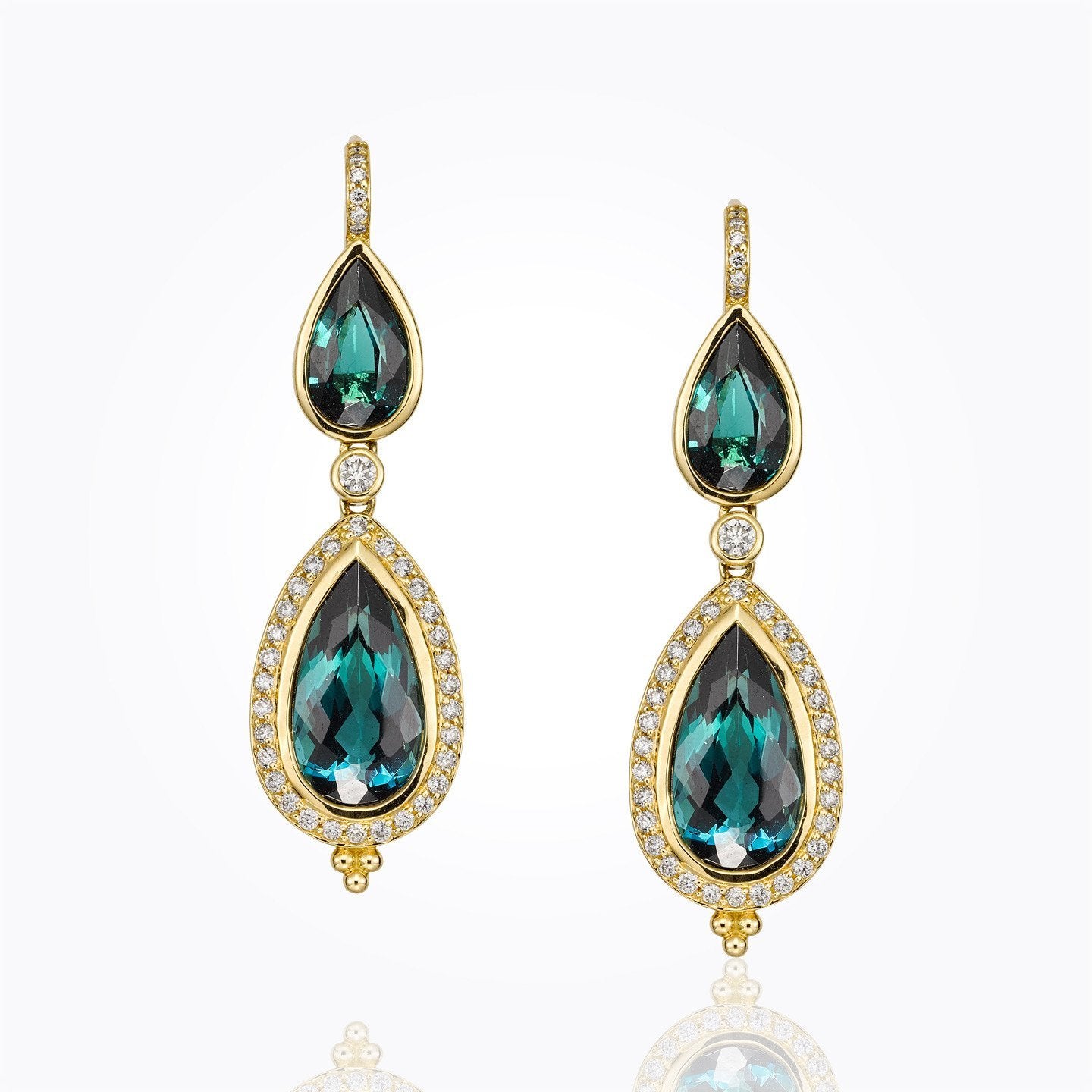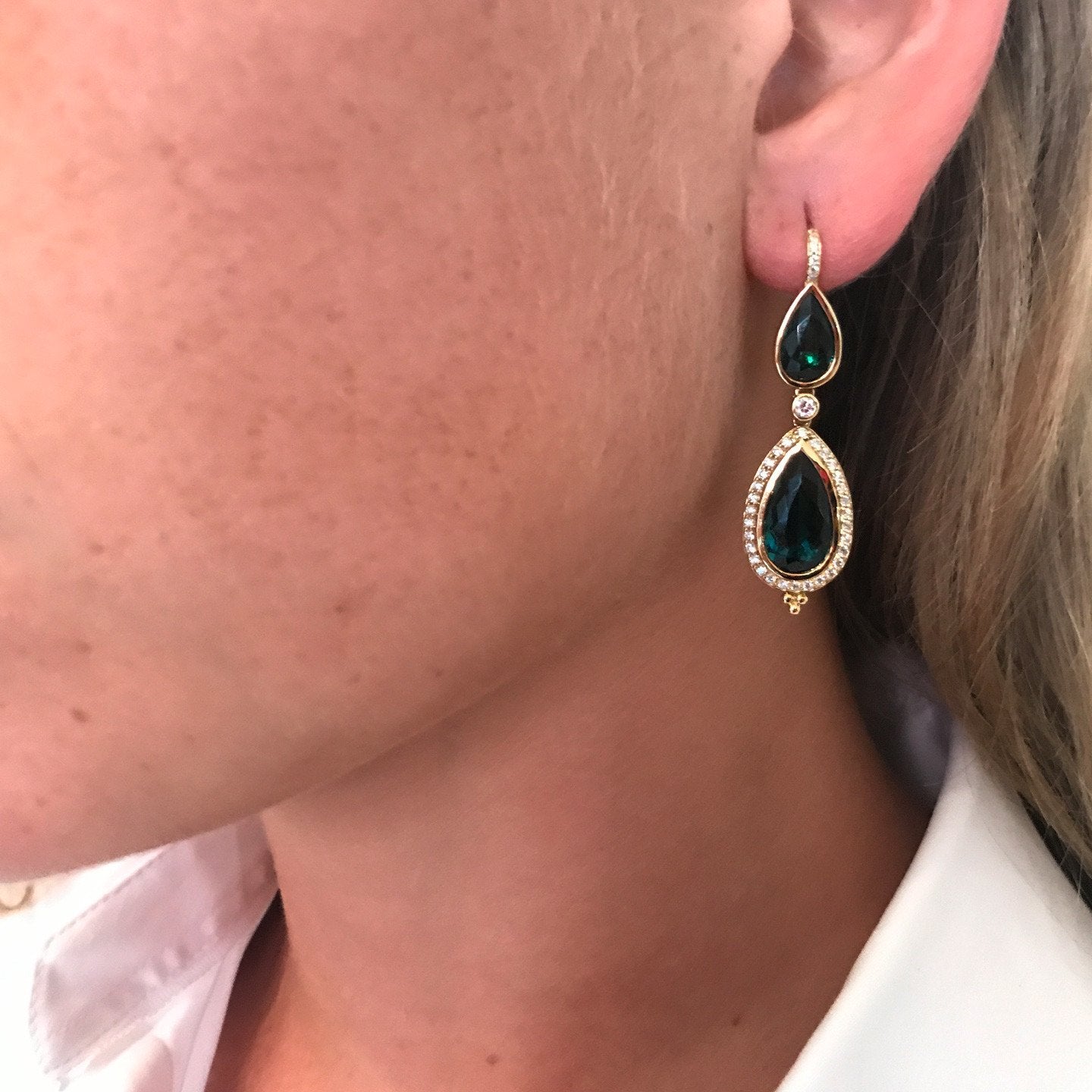 18K Double Drop Earrings with blue green tourmaline and diamond pavé
