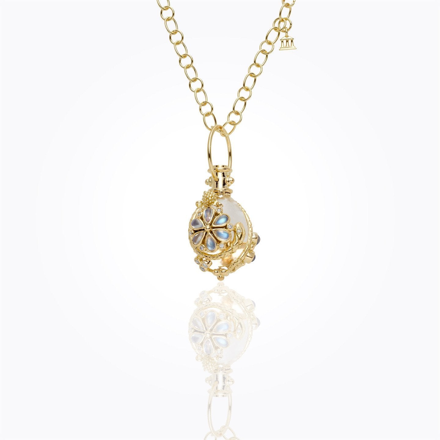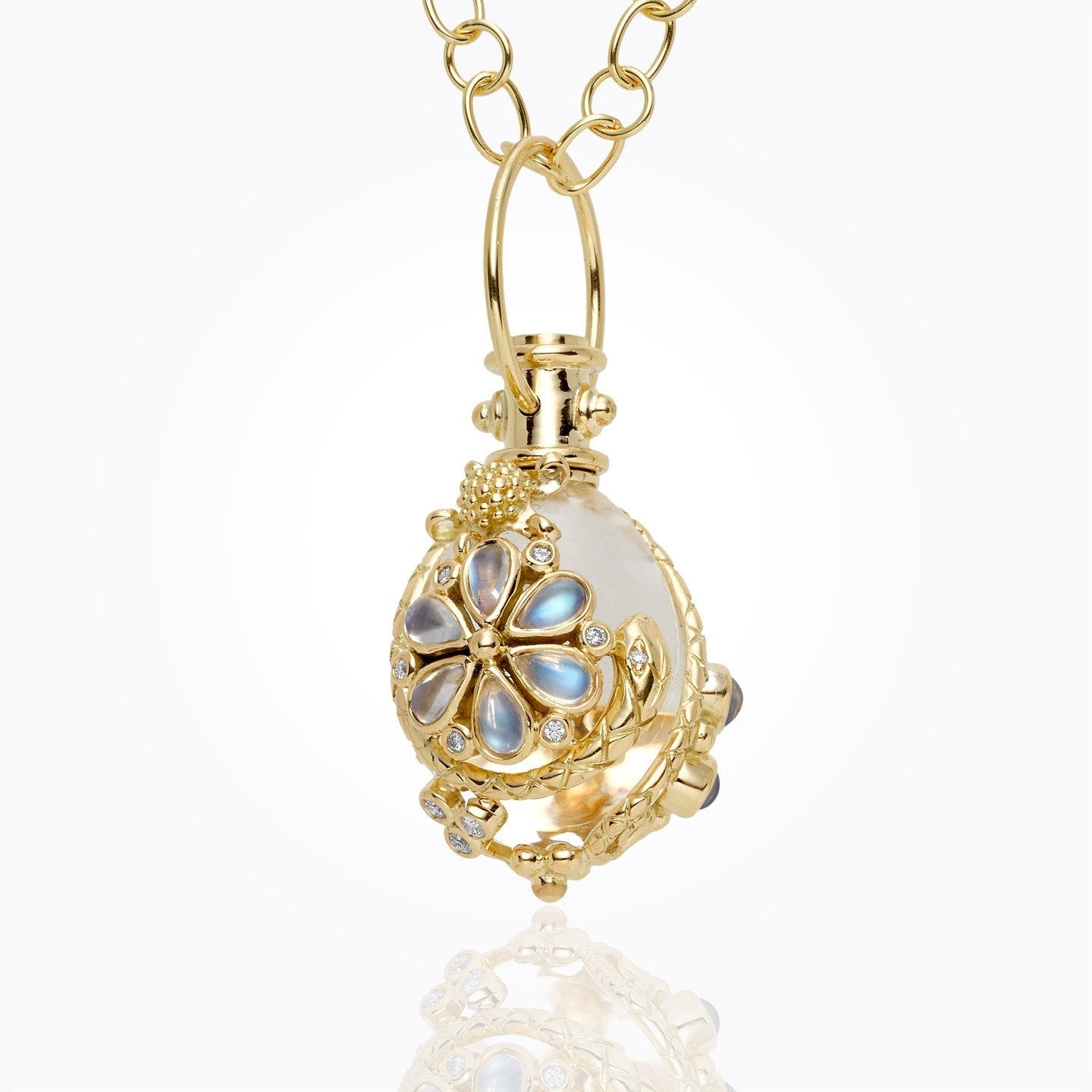18K Flower Serpent Amulet with rock crystal, royal blue moonstone, blue sapphire, and diamond